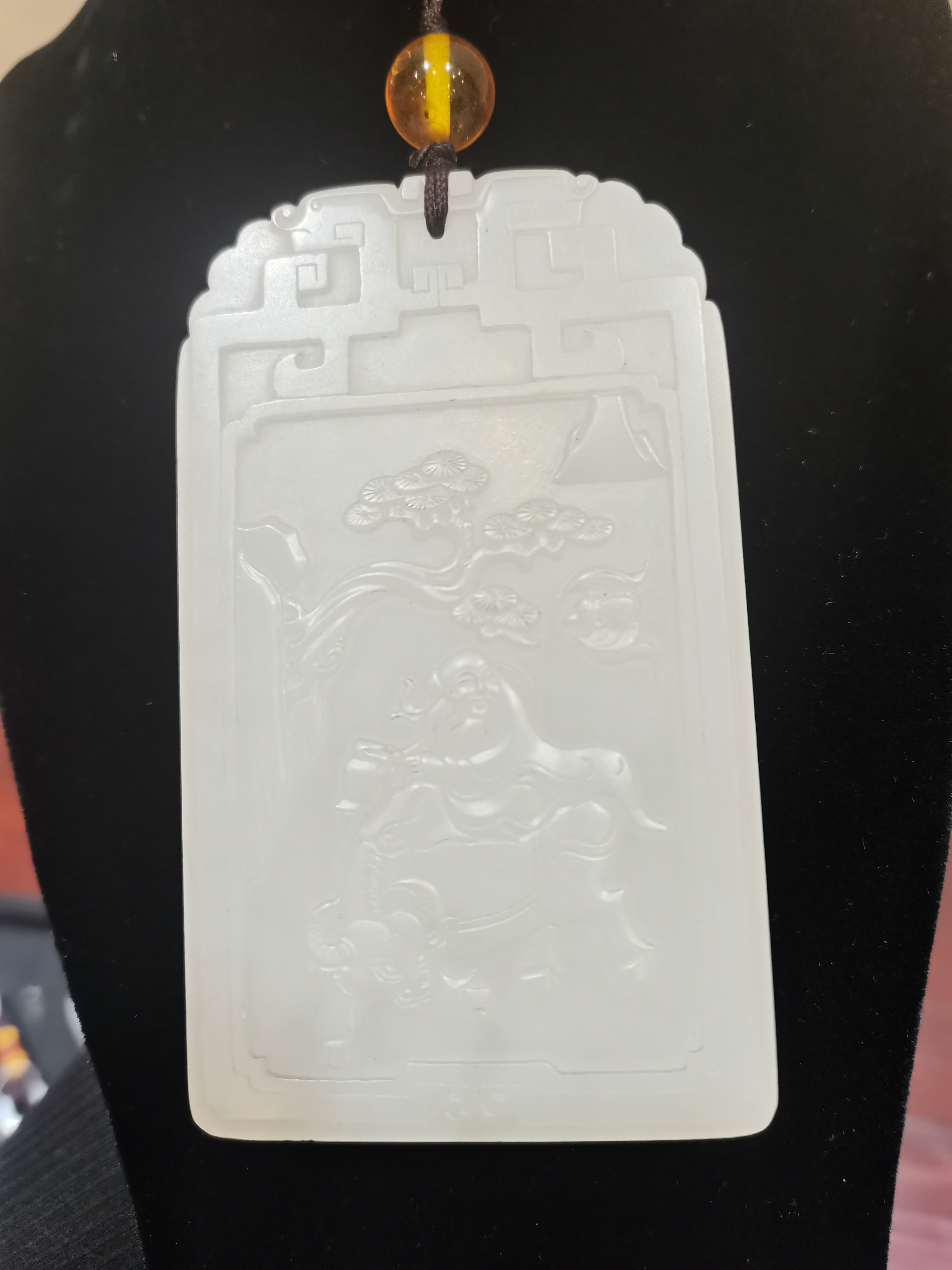 玉牌雕刻老子西出函谷關(guān)游歷天下的傳說。老子面容安詳可親,坐于青牛背上,手持《道德經(jīng)》。身下青牛牛首低垂,四蹄強(qiáng)健。背景雕出雄關(guān)翠松,更有一只蝙蝠悠然而飛。“蝠”與“福”字諧音,故玉牌還包含了福氣、吉祥之意。玉牌背面浮雕十四個(gè)大字:函谷西去路漫漫,紫氣東來道綿綿。此便謂:老子出關(guān),紫氣東來。