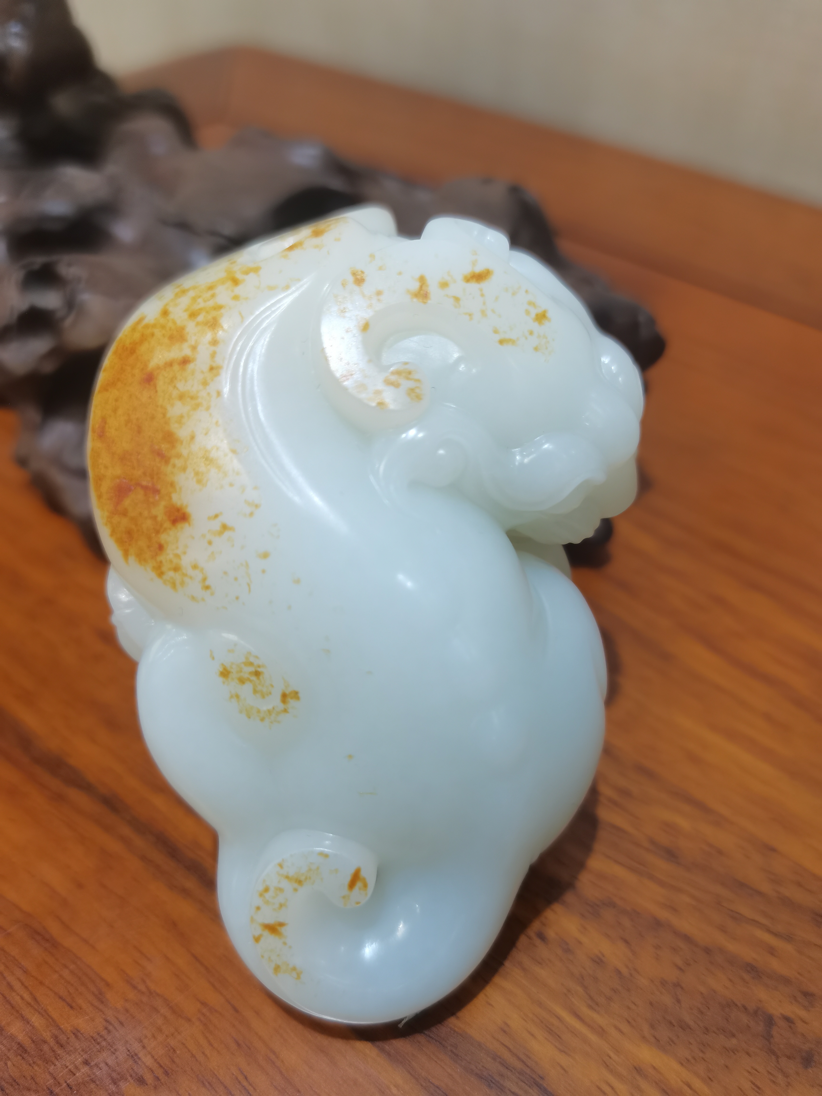 此款把件通體白皙,成色均勻,玉質十分溫潤細膩;灑金皮色十分漂亮。造型圓潤飽滿、線條流暢、賦予張力,神態鮮活靈動,是為不可多得的收藏、傳世極品。